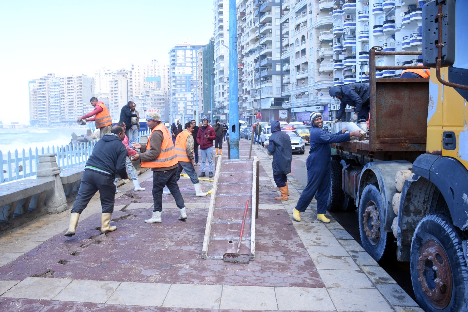 وأضاف الشريف أن هيئة جهاز تعمير الساحل الشمالي وحماية الشواطئ بالتنسيق مع المقاولون العرب والجهات المختصة بدأوا على الفور في التعامل مع النحر، حيث تم وضع كتل خرسانية تمهيدا لوضع بلوكات، وحماية الرصيف والشاطئ، ومعالجة الإنشقاقات، وما أتلفته الأمواج. مُضيفا أنه تم عمل شريط أصفر وعلامات إرشادية بنطاق المنطقة المتضررة لتنبيه المواطنين باتخاذ الحذر وعدم السير في تلك المنطقة المحددة حفاظا على سلامتهم.