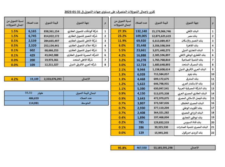 وقالت إن حجم التمويل بنهاية يناير الماضي، سجل 55.5 مليار جنيه، موزعة بين 53.1 مليار جنيه قدمتها البنوك، و2.3 مليار جنيه من الشركات، ل 486659 مستفيدا.