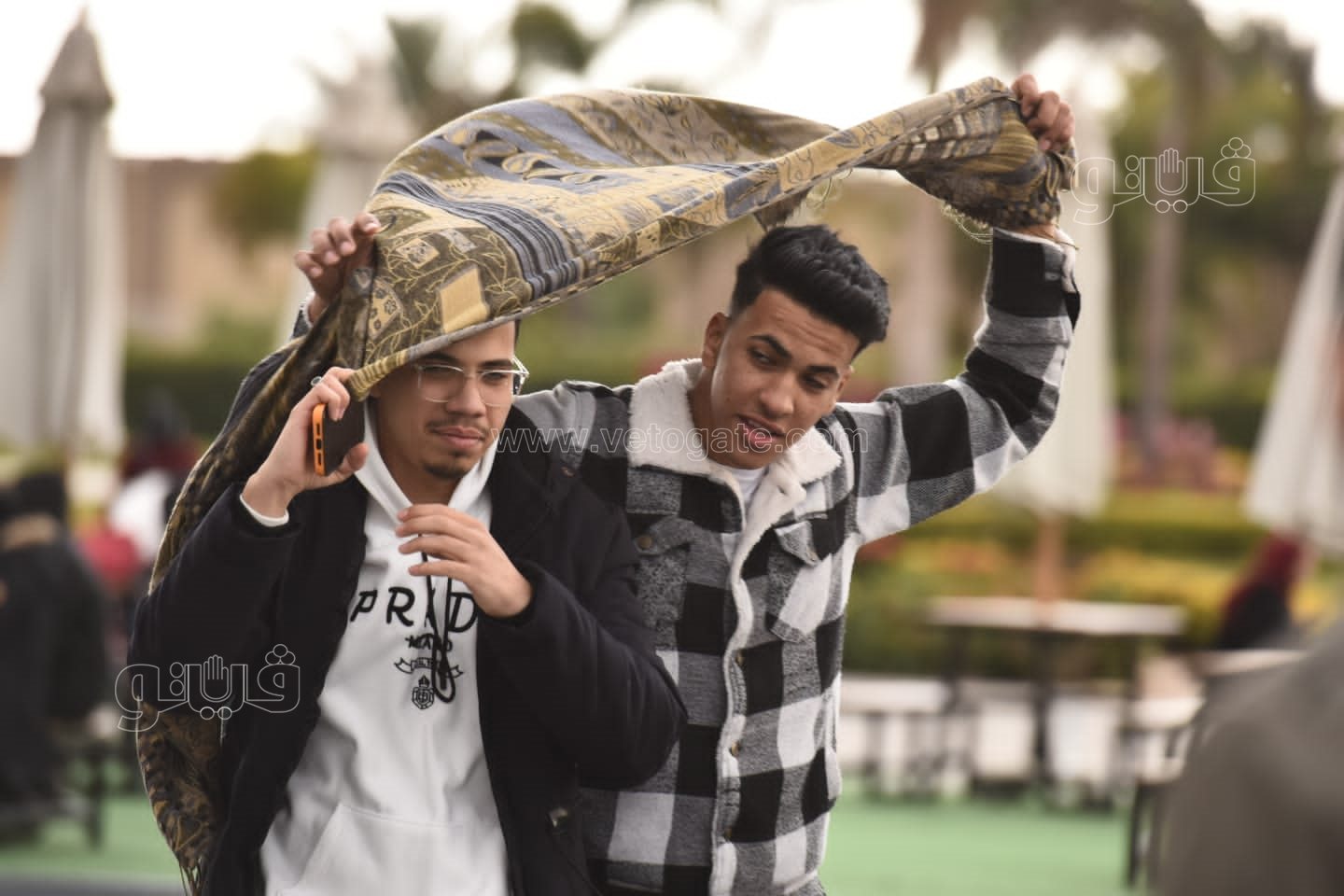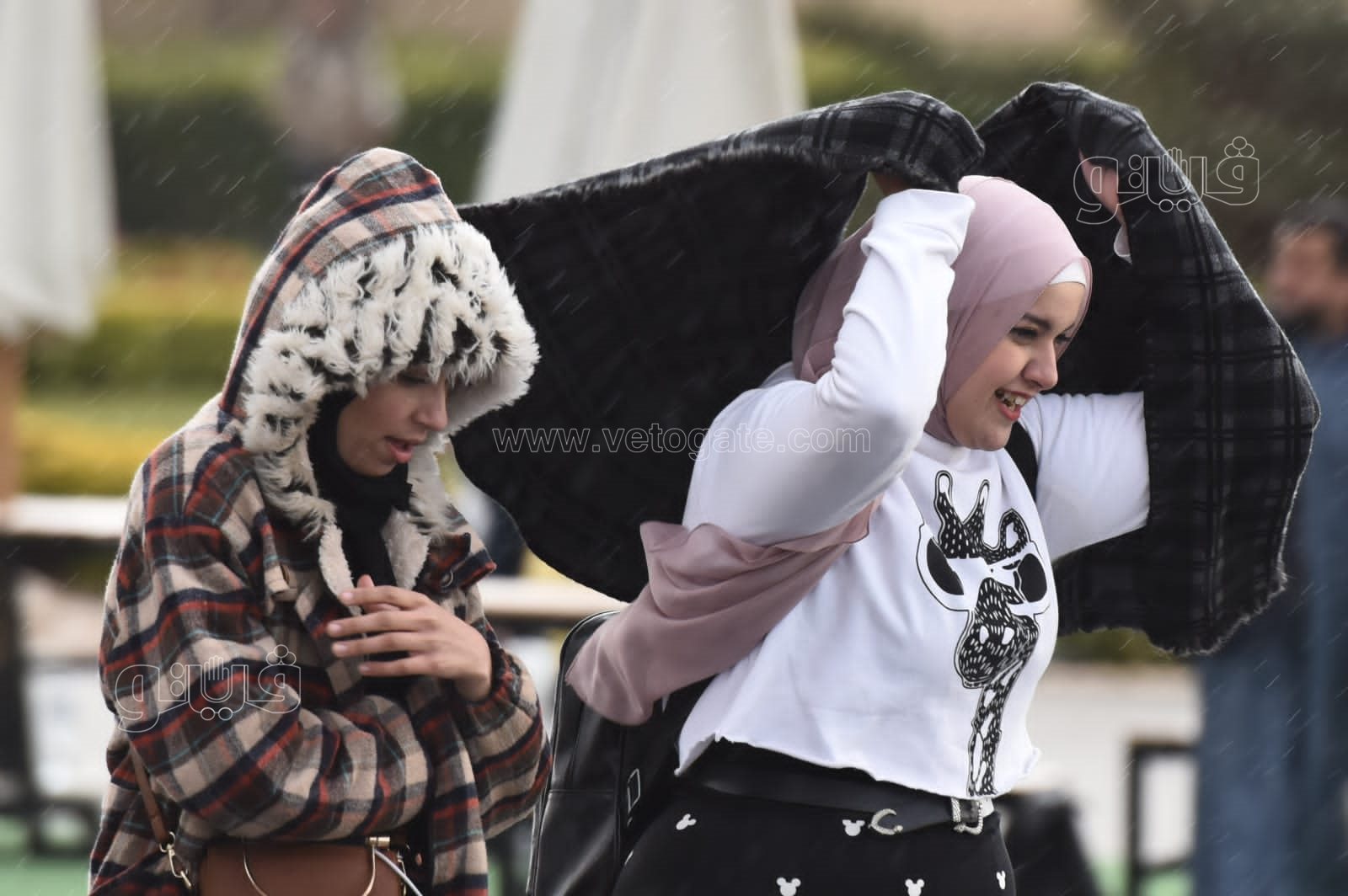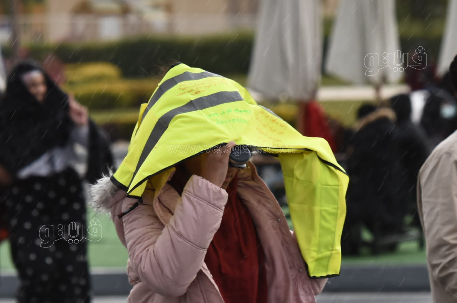وفور تساقط الأمطار، أقدم الجمهور على الاحتماء بالمظلات المتواجدة داخل ساحات المعرض، كما ارتدى بعض الزوار أغطية الرأس أثناء الأمطار.