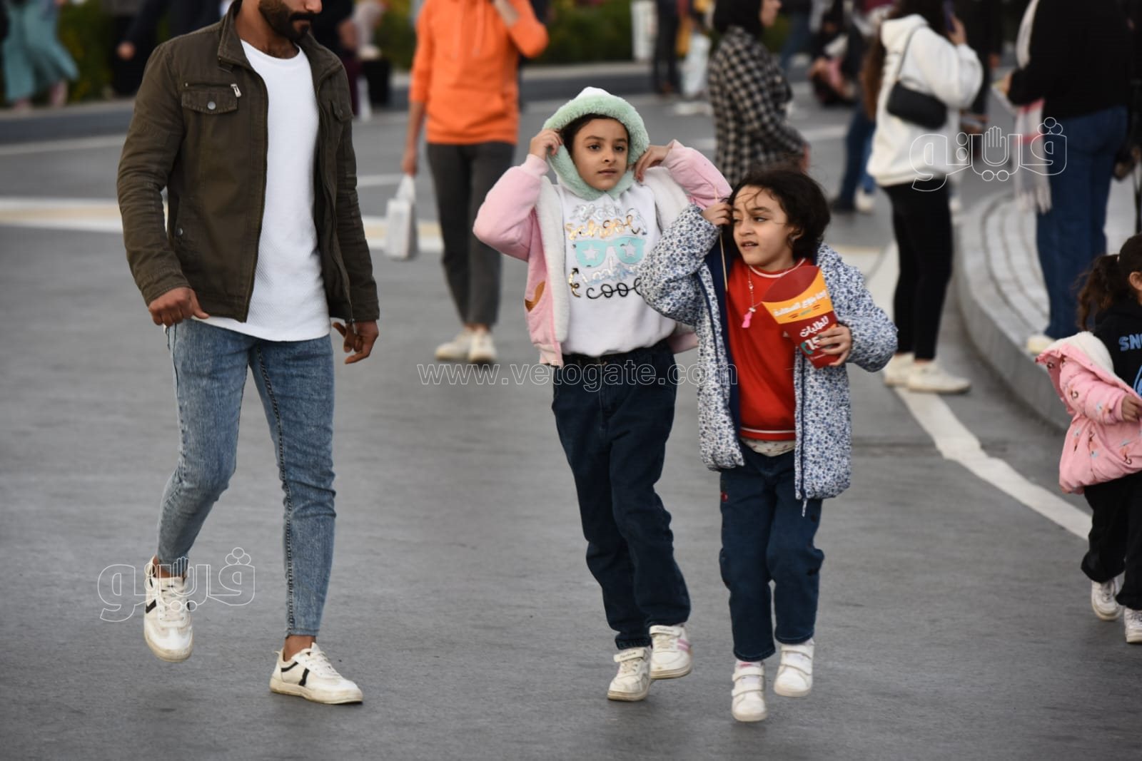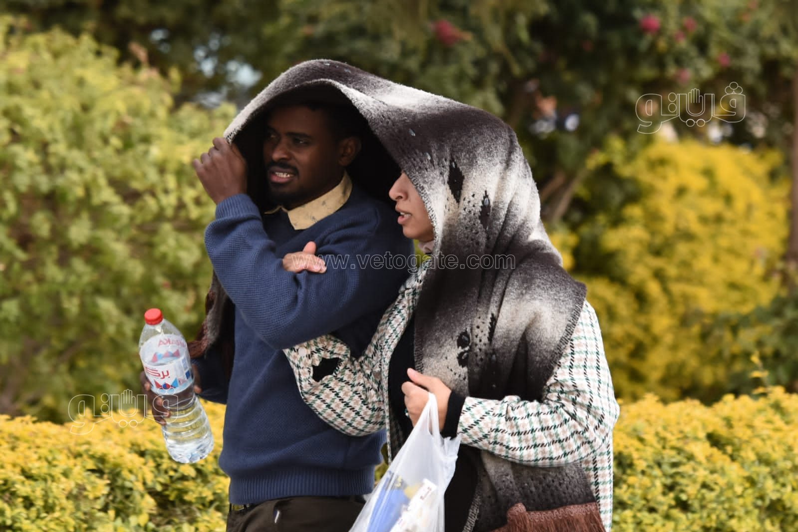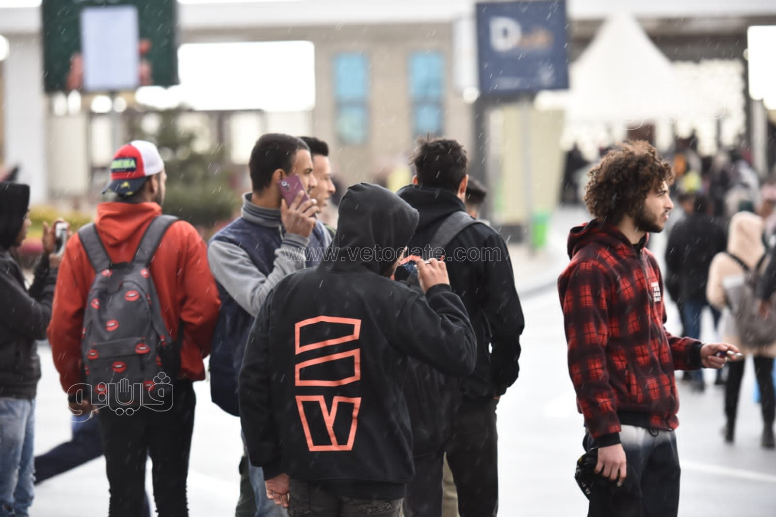 وفور تساقط الأمطار، أقدم الجمهور على الاحتماء بالمظلات المتواجدة داخل ساحات المعرض، كما ارتدى بعض الزوار أغطية الرأس أثناء الأمطار.