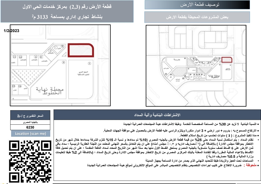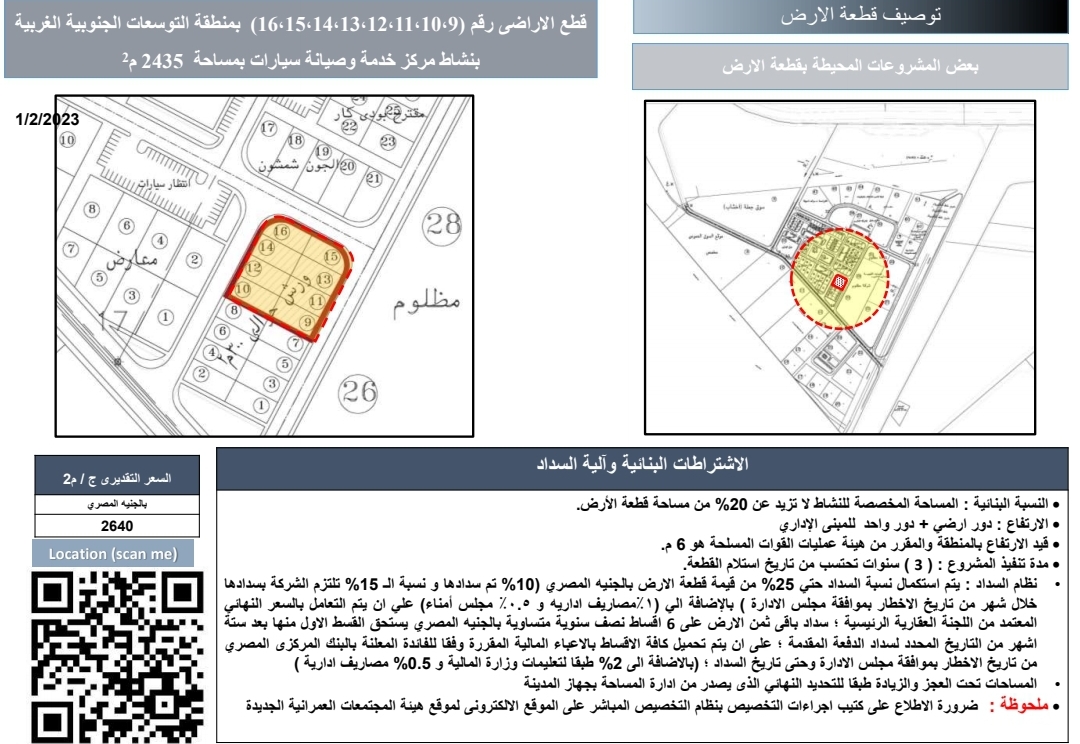 بالإضافة إلى قطع الاراضي رقم 14،13،12،11،10-15-16 بمنطقة التوسعات الجنوبية الغربية بنشاط مركز خدمة وصيانة سيارات بمساحة 2435 متر مربع وقطعة الأرض رقم (2.3) بمركز خدمات الحي الأول بنشاط تجاري إداري بمساحة 3133 متر مربع.