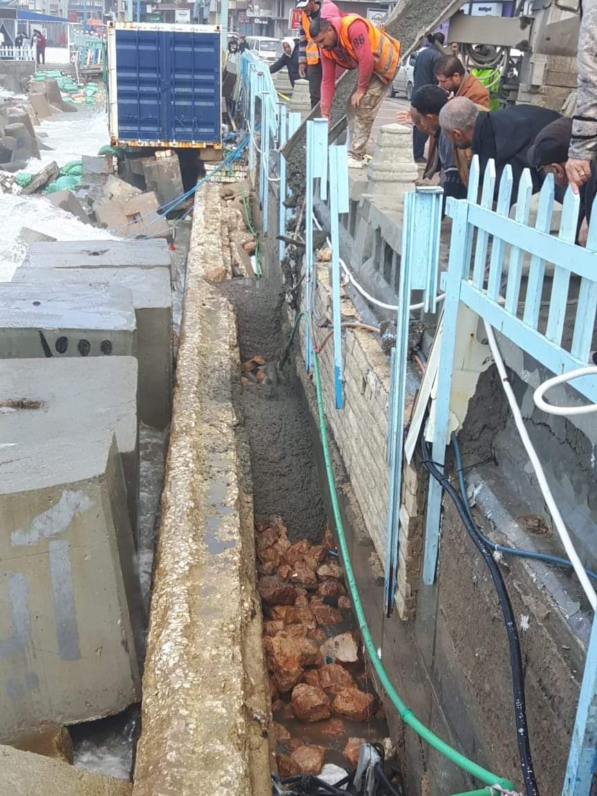 وأكد المحافظ، أنه جرى استدعاء جهاز تعمير الساحل الشمالى وشركة المقاولون العرب للعمل على إصلاح الأمر والذي جاء نتيجة لنحر البحر وارتفاع الأمواج وشدتها بسبب سوء الأحوال الجوية، وسيجري وضع كتل خرسانية لمنع نحر البحر للكورنيش.