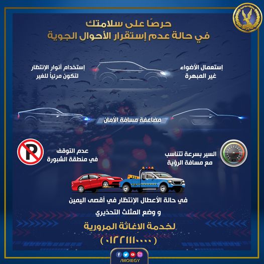 كما تضمنت النصائح عدم التوقف فى منطقة الشبورة المائية، وفى حالة الأعطال الانتظار فى أقصى اليمين ووضع المثلث التحذيري لخدمة الإغاثة المرورية تحت رقم "01221110000".