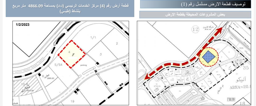 قطعة أرض رقم (4)مركز الخدمات الرئيسي (د) بمساحة 4866.09 متر مربع بنشاط طبي وسعرها التقديري 7935 جنيه مصري للمتر مربع.