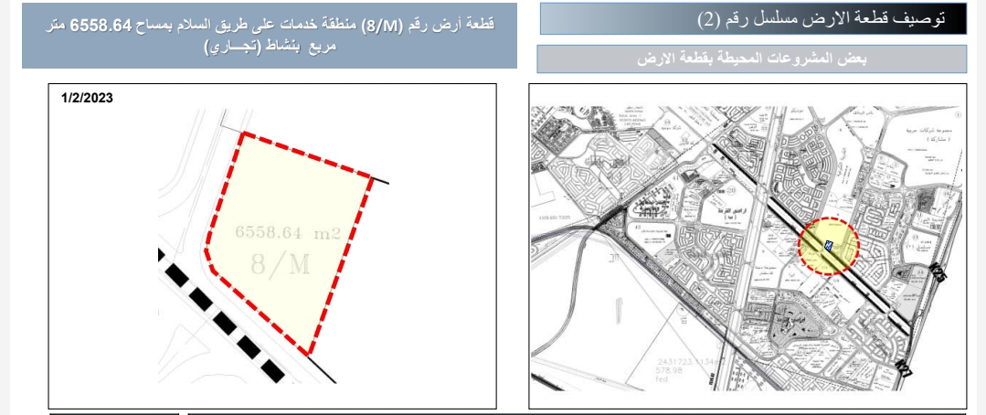 قطعة أرض رقم (8) منطقة خدمات على طريق السلام بمساح 6558.64 متر مربع بنشاط تجاري) وسعرها التقديري 13575 جنيه مصري للمتر مربع.