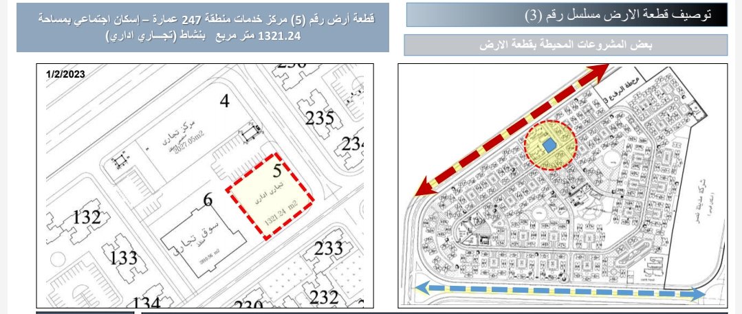 قطعة أرض رقم (5) مركز خدمات منطقة 247 عمارة – إسكان اجتماعي بمساحة 1321.24 متر مربع بنشاط تجاري اداري) وسعرها التقديري 9100 جنيه مصري للمتر مربع.