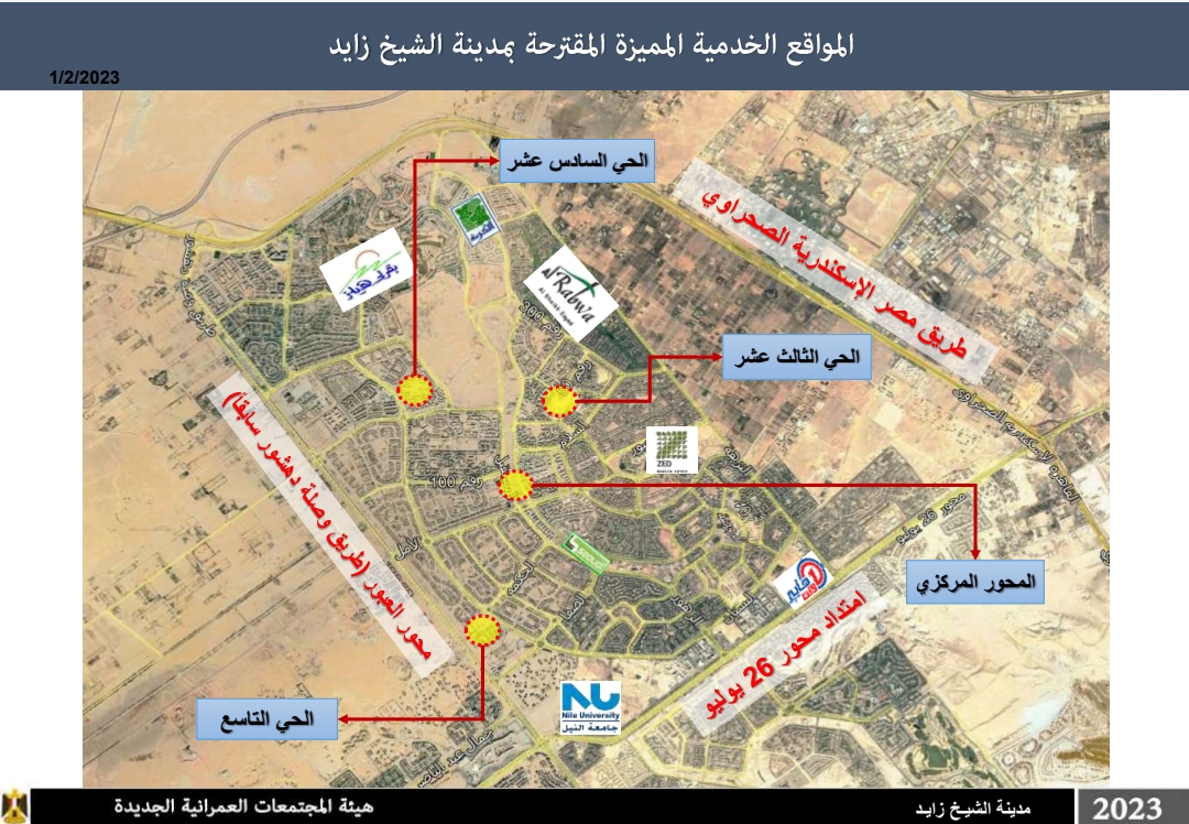 وحددت هيئة المجتمعات العمرانية الجديدة قطع الأرض بمدينة الشيخ زايد بنظام التخصيص الفوري بنشاط خدمي استثماري، وتكون كالآتي: