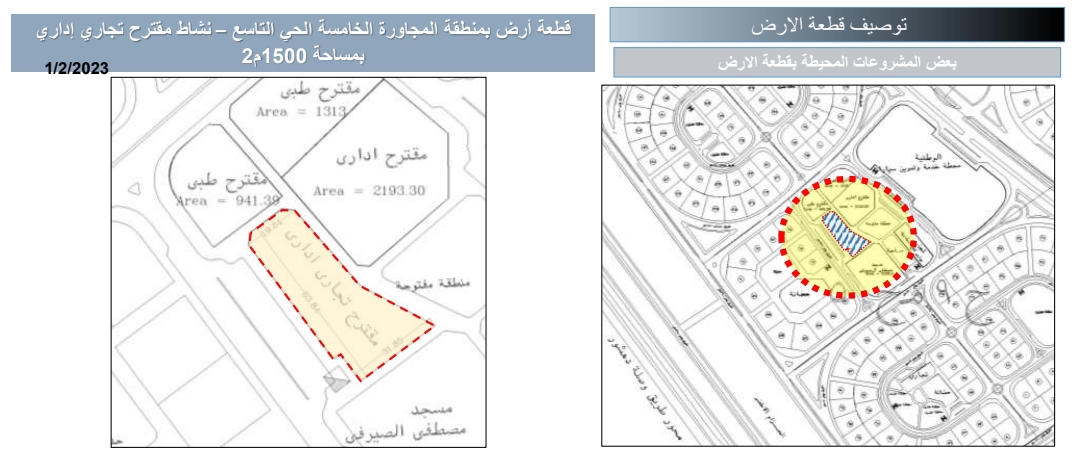 قطعة أرض بمنطقة المجاورة الخامسة الحي التاسع – نشاط مقترح تجاري إداري بمساحة 1500م2 وسعرها التقديري 25475 جنيه مصري للمتر مربع.