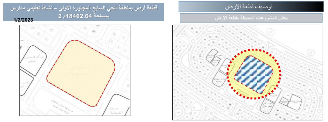 قطعة أرض بمنطقة الحي السابع المجاورة الأولى – نشاط تعليمي مدارس بمساحة 18462.64م2 وسعرها التقديري 14780 جنيه مصري للمتر مربع.