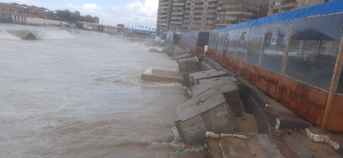 تداعيات الطقس على الإسكندرية، غلق شاطئ وانشقاق رصيف الكورنيش وسقوط أعمدة إنارة (صور)
