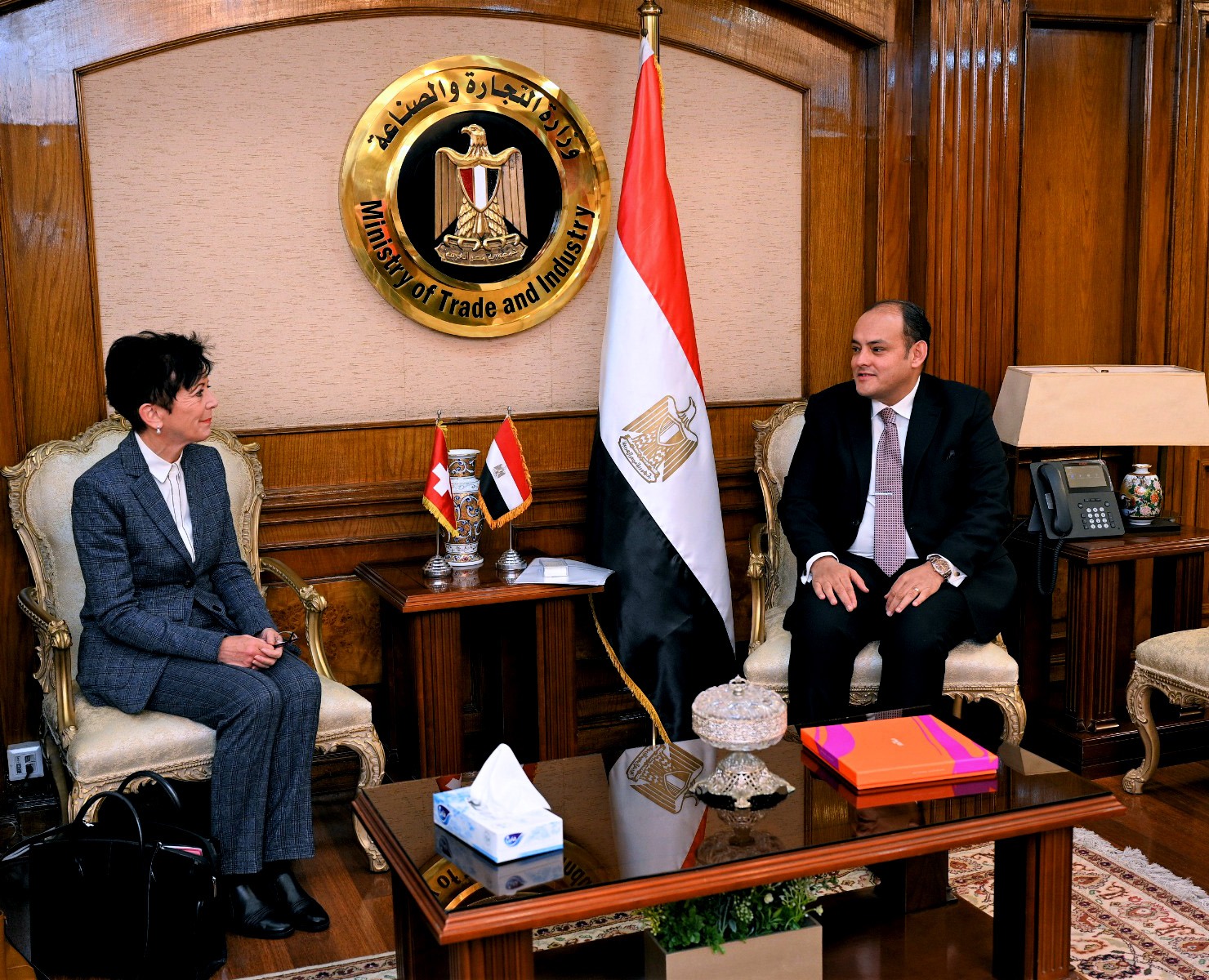 عقد المهندس أحمد سمير وزير التجارة والصناعة لقاءً مع إيفون باومان سفيرة سويسرا بالقاهرة حيث تناول اللقاء سبل تعزيز العلاقات الاقتصادية المشتركة بين البلدين فى مجالات التجارة والصناعة والاستثمار وحضر اللقاء الوزير مفوض تجارى يحيى الواثق بالله رئيس جهاز التمثيل التجارى وفاليرى ليختى رئيس مكتب التعاون الدولى بالسفارة السويسرية بالقاهرة.
