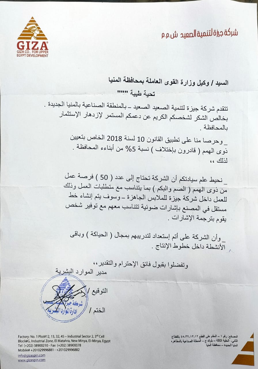 وقالت الوزارة في بيان اليوم الثلاثاء إن الوزير حسن شحاتة تلقى تقريرًا من مديرية القوى العاملة بمحافظة المنيا، بشأن استلامها طلبًا من شركتي "جيزة لتنمية الصعيد"، والمتخصصة لصناعة الملابس الجاهزة، و"الدلتا تكستايل" الكائنة في شمال الصعيد ومتخصصة في لصناعة الملابس الجاهزة بالمنطقة الصناعية بالمنيا الجديدة،توضح فيه "للمديرية"، عن احتياجها لـ 80 فرصة عمل للأشخاص من ذوي الإعاقة، و"الصم والبكم" من أبناء محافظة المنيا وذلك بما يتناسب مع متطلبات العمل داخل الشركتين.