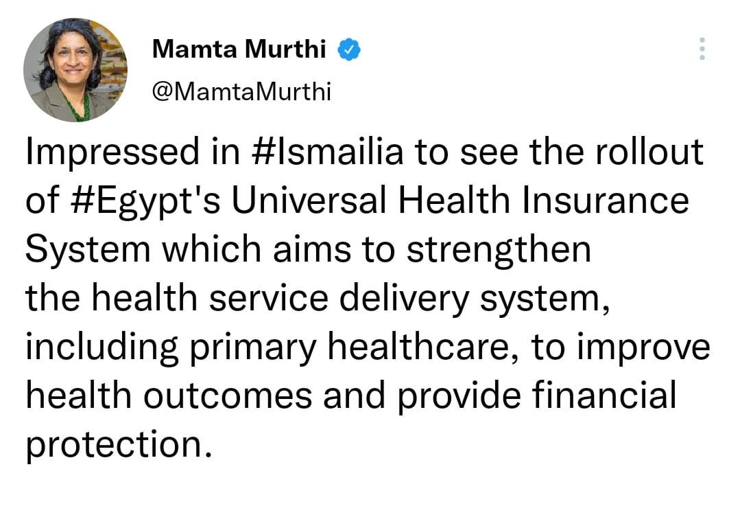 وقالت خلال التغريدة "أعجبت في الإسماعيلية بتطبيق نظام التأمين الصحي الشامل بمصر، والذي يهدف إلى تقوية نظام تقديم الخدمات الصحية، بما في ذلك تطبيق مفهوم الرعاية الصحية الأولية لتحسين جودة مخرجات الرعاية الصحية، إضافة إلى ضمان توفير الملاءة المالية."