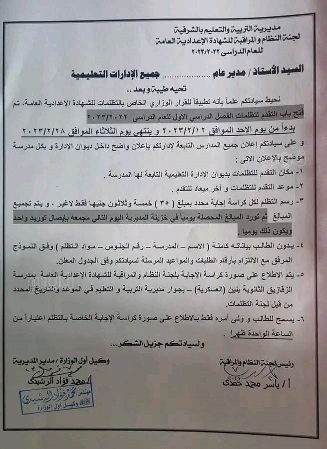 وأكدت مديرية التربية والتعليم أنه سيتم قبول تظلمات الشهادة الإعدادية للفصل الدراسي الأول للعام الدراسي 2022 -2023 بدءًا من يوم الأحد الموافق 2023/2/12 وينتهي يوم الثلاثاء 28 فبرايرالمقبل وتقديم التظلمات سيكون بالإدارة التعليمية التابعة لها المدرسة.