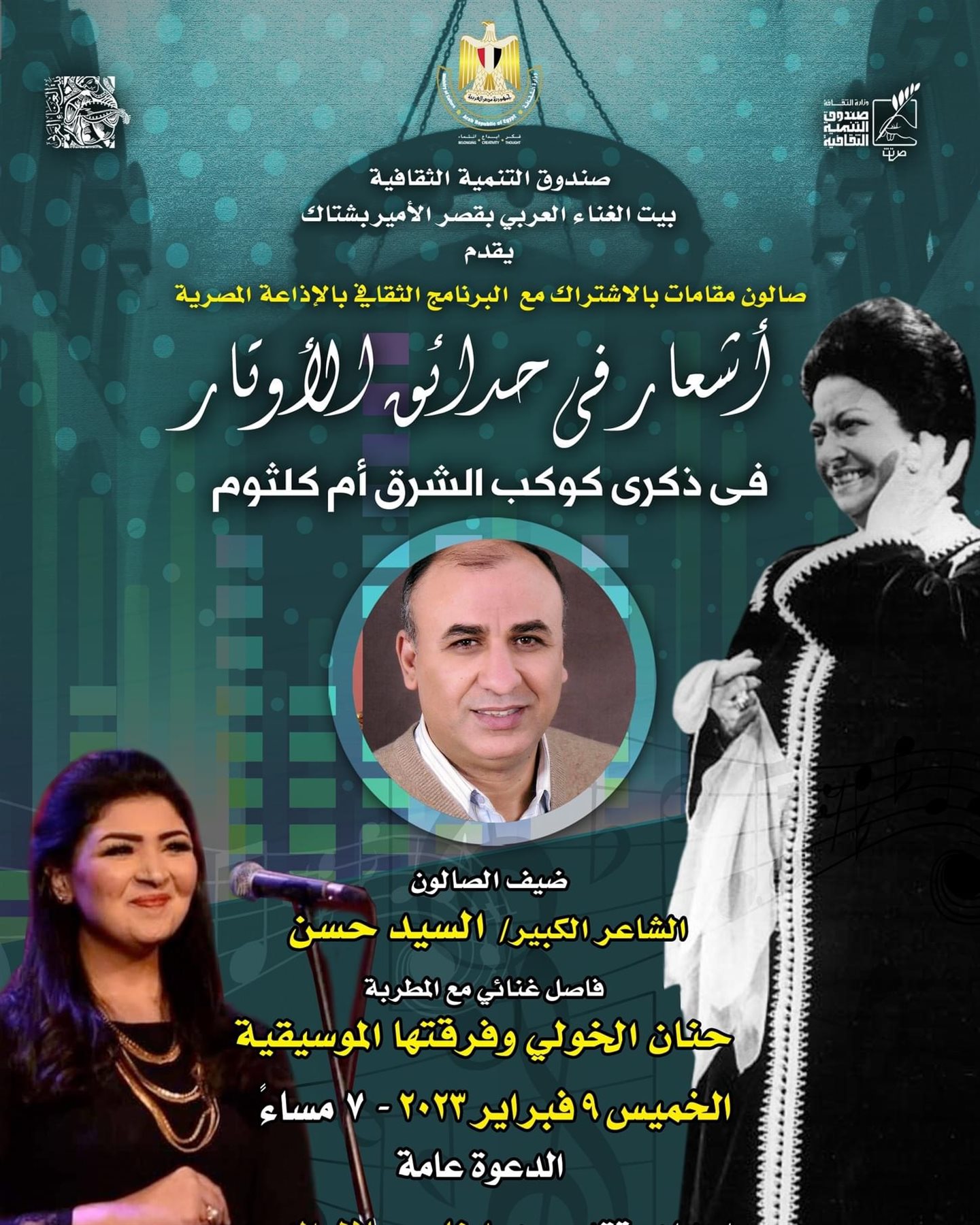 يستضيف بيت الغناء العربى بقصر الأمير بشتاك في شارع المعز، التابع لقطاع صندوق التنمية الثقافية صالون مقامات، الذي يقام هذا الشهر تحت عنوان "أشعار في حدائق الأوتار"، بالاشتراك مع البرنامج الثقافي بالإذاعة المصرية.
