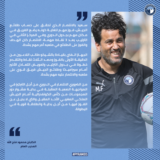 بيراميدز، عبر محمود فتح الله مدرب نادي بيراميدز عن سعادته بالانتصار الذي تحقق على حساب طلائع الجيش، موضحا أنه فوز مهم للغاية، كونه يضع الفريق في مكان مهم بجدول الدوري، وفي المركز الثاني في الترتيب بعد ٣ نقاط مهمة، مشددا على أن الانتصار كان الهدف والفوز على الطلائع في ملعبه أمر مهم بشدة.