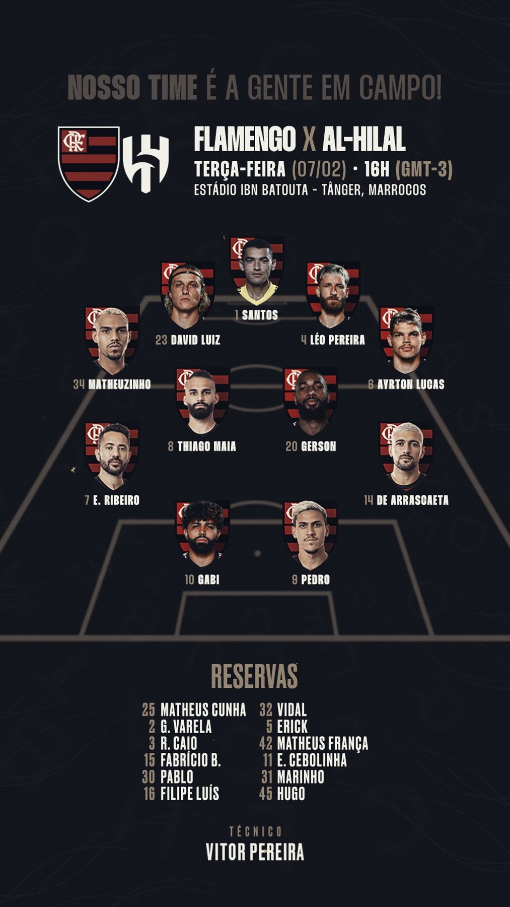 أعلن فيكتور بيريرا المدير الفني لفريق فلامنجو البرازيلي تشكيل فريقه لمواجهة الهلال السعودي، مساء اليوم الثلاثاء، في نصف نهائي مونديال الأندية المقام في المغرب.