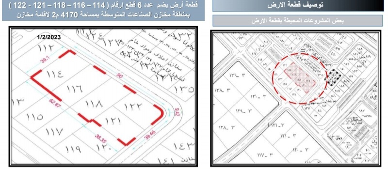 قطعة أرض بضم عدد 6 قطع أرقام (114-11-118 - 121 - 122 ) بمنطقة مخازن الصناعات المتوسطة بمساحة 4170 م2 لاقامة مخازن وسعرها التقديري 2000 جنيه مصري للمتر مربع.