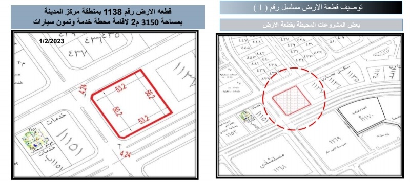 قطعه الأرض رقم 1138 بمنطقة مركز المدينة بمساحة 3150 م 2 لإقامة محطة خدمة وتمون سيارات وسعرها التقديري 4730 جنيها مصريا للمتر مربع.