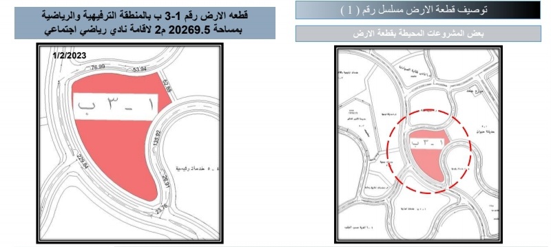 قطعة الأرض رقم ( 1ب) بالمنطقة الترفيهية والرياضية بمساحة 20269.5 م2 لإقامة ناد رياضي اجتماعي وسعرها التقديري 1980 جنيها مصريا للمتر مربع.