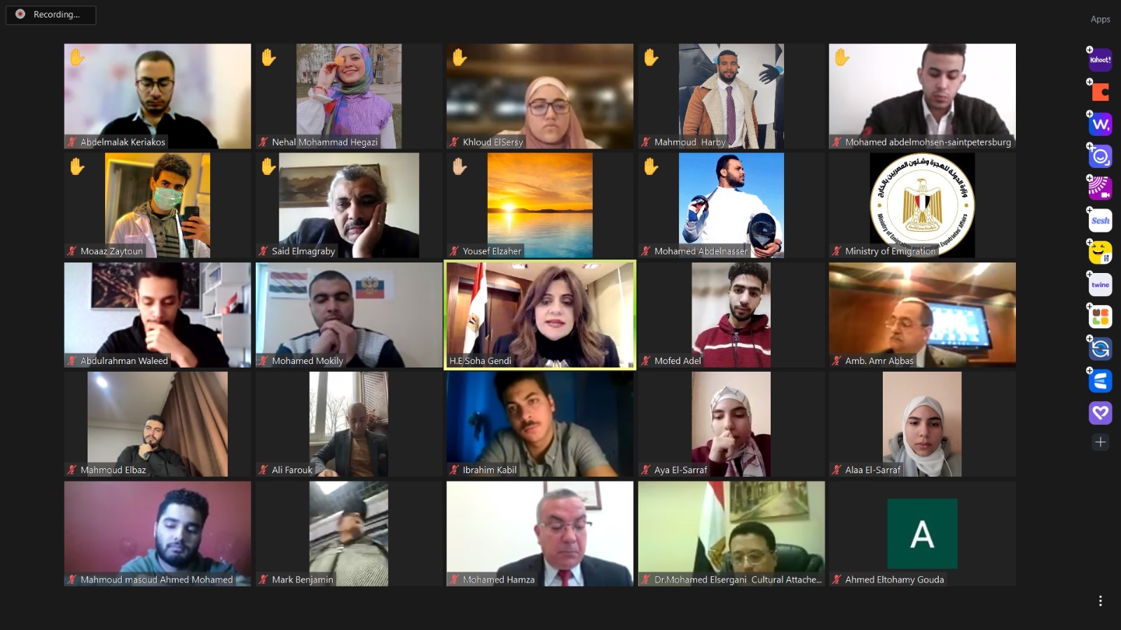 كما شارك في اللقاء الدكتور محمد السرجاني الملحق الثقافي المصري في روسيا، وممثلي الجالية ومركز وزارة الهجرة للحوار لشباب الدارسين بالخارج، وبحضور الأستاذة نيرمين كمال وكيل محافظ مساعد - قطاع الرقابة والإشراف ممثلة عن البنك المركزي، واللواء إيهاب الحيني، ممثلًا عن مصلحة الأحوال المدنية، وعقيد محمد شرشر، مدير إدارة الشئون القانونية بالإدارة العامة للجوازات والهجرة والجنسية بوزارة الداخلية، بالإضافة إلى مشاركة أشرف عطية، ممثلًا عن الهيئة العامة للتأمين الاجتماعي، والدكتورة إلهام فتحي، مدير إدارة أبناؤنا في الخارج، ممثلة عن وزارة التربية والتعليم، والدكتور محمد حمزة رئيس قطاع الشئون الثقافية والبعثات ممثل عن وزارة التعليم العالي، وذلك للرد على استفسارات المصريين بالخارج.