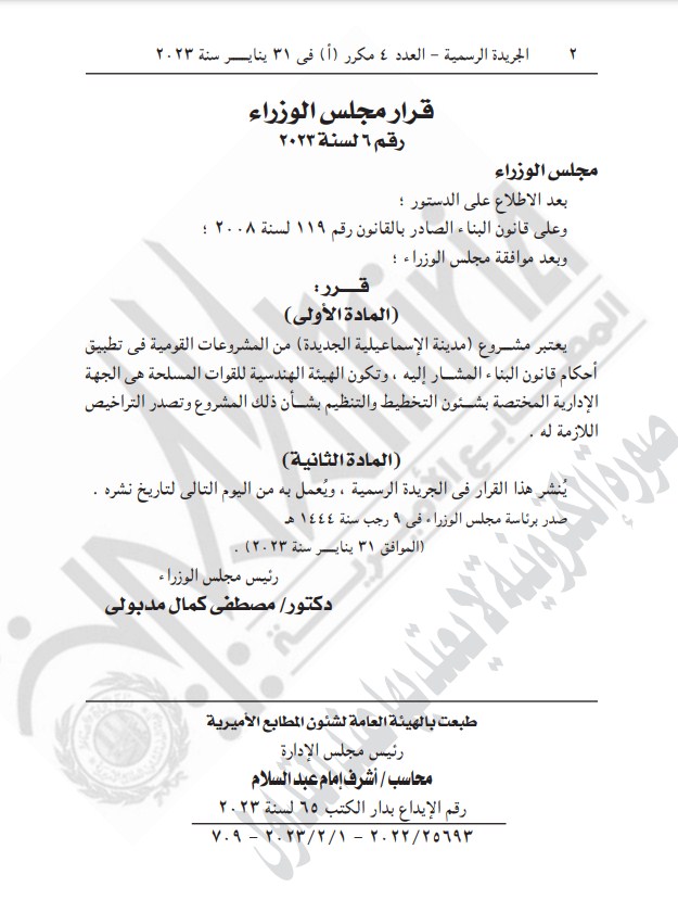 نشرت الجريدة الرسمية في عددها رقم 4 مكرر (أ)، الصادر في 31 يناير 2023، قرار مجلس الوزراء برئاسة الدكتور مصطفى مدبولي رقم 6 لسنة 2023، بشأن اعتبار مشروع مدينة الإسماعيلية الجديدة من المشروعات القومية.