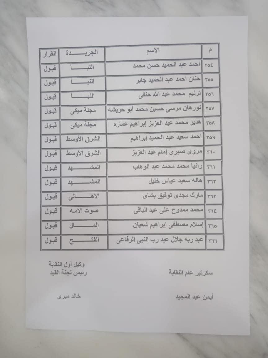 ويذكر أن لجنة القيد قررت فتح باب تقديم الأوراق للانتقال إلى جدول المشتغلين للصحفيين الذين أتموا مدتهم القانونية وذلك من الفترة١٩نوفمبر الماضي وحتى ١ ديسمبر.