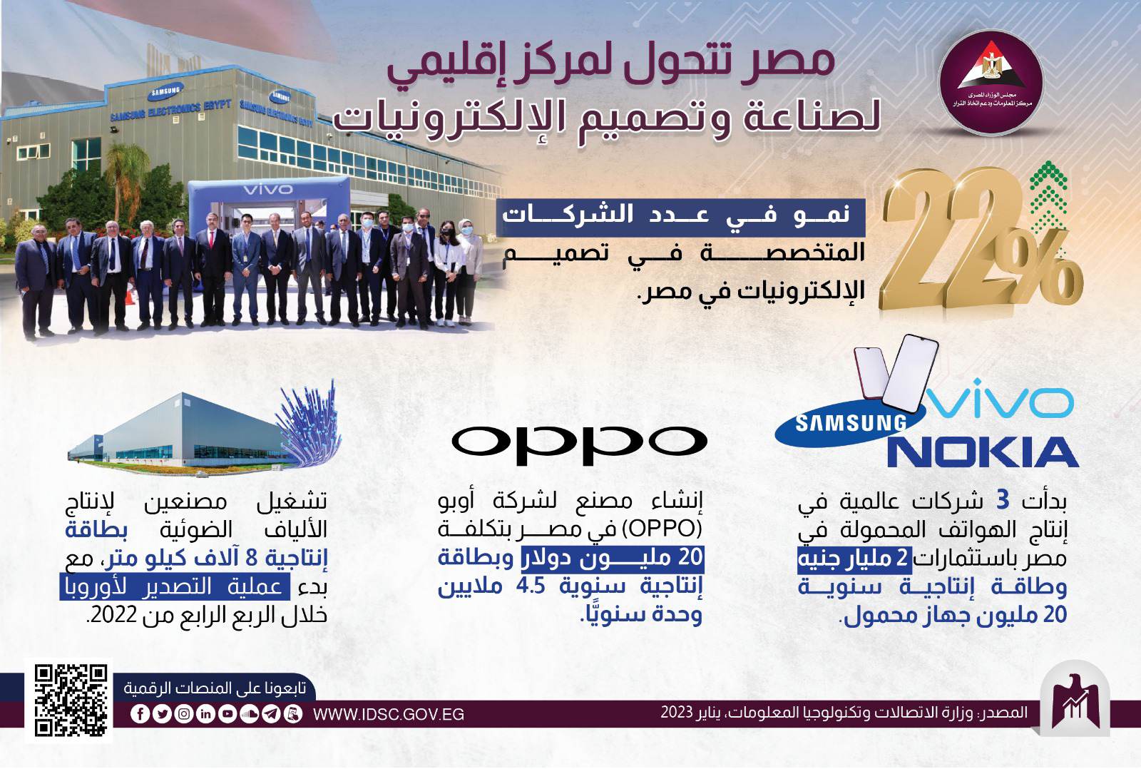 وذلك بجانب إنشاء مصنع لشركة أوبو (OPPO) في مصر بتكلفة 20 مليون دولار وبطاقة إنتاجية سنوية 4.5 ملايين وحدة سنويًّا، وقد شهدت الشركات المتخصصة في تصميم الإلكترونيات في مصر ارتفاعًا ملحوظًا في السنوات الأخيرة وذلك بنسبة 22%، إضافة إلى تشغيل مصنعين لإنتاج الألياف الضوئية بطاقة إنتاجية 8 آلاف كيلو متر، مع بدء عملية التصدير لأوروبا خلال الربع الرابع من 2022.