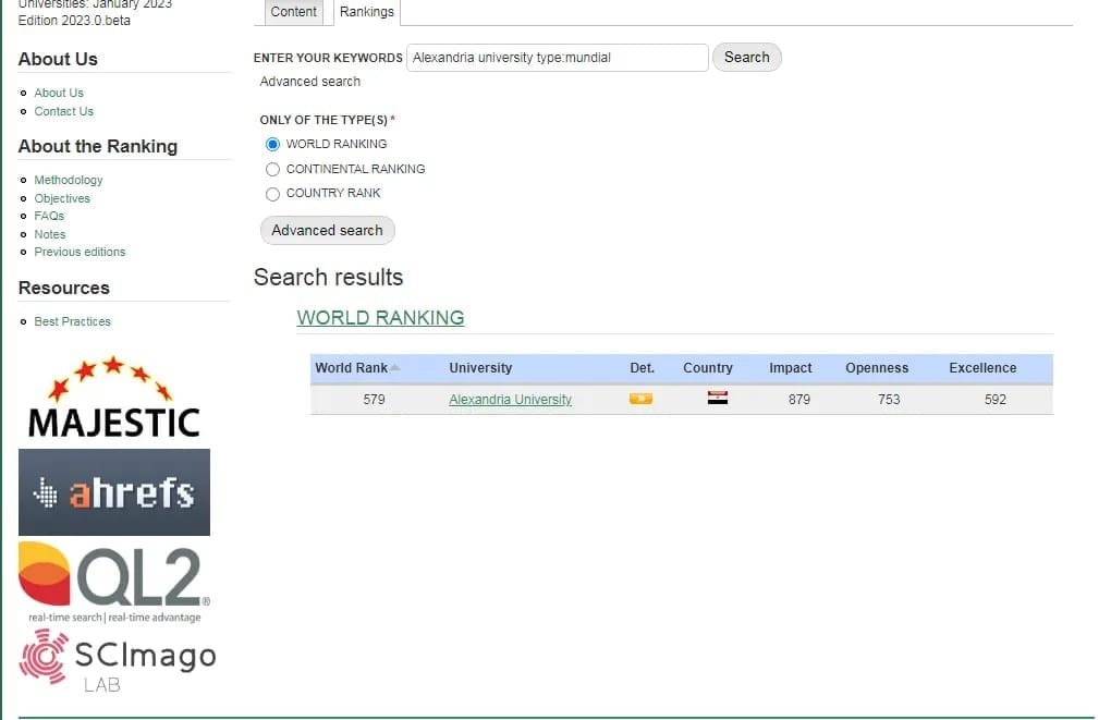 أعلن الدكتور عبد العزيز قنصوة، رئيس جامعة الإسكندرية، أن نتائج تصنيف ويبوميتريكس “webometrics” الأسباني العالمي - إصدار يناير 2023، تضمن تقدم جامعة الإسكندرية 153 مركزًا عالميًا عن يناير العام الماضي، حيث جاءت فى المركز ٥٧٨ عالميًا مقابل المركز 731 في يناير 2022 وذلك من بين ٣٠ ألف جامعة على مستوى العالم.