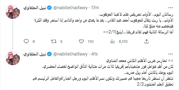 وكتب نبيل الحلفاوي تغريدة على تويتر، عبارة عن رسالتين للاعبين في مباراة الأهلي ضد ريال مدريد، فقال: "رسالتان اليوم.. الأولى تحريض على لاعبنا الموهوب. الأولي.. يا ريت يتقال للموهوب أحمد عبد القادر.. بعد ما يعدي من واحد والتاني إذا استمر وفقد الكرة هيتخصم منه مبلغ كذا".