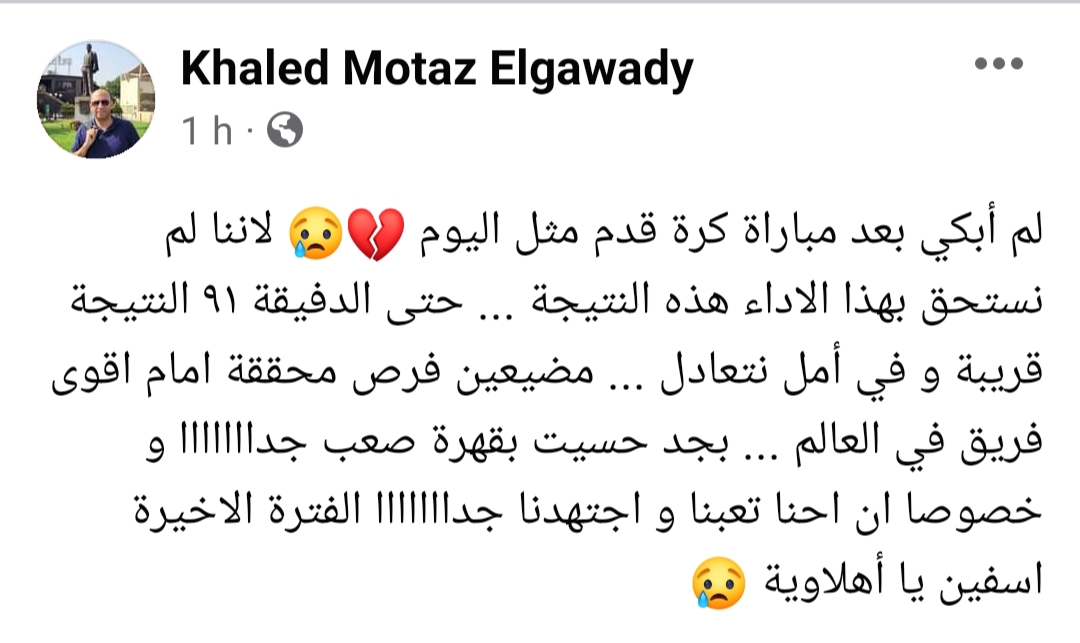 وأضاف: حتى الدقيقة ٩١ النتيجة قريبة وفي أمل نتعادل.. مضيعين فرص محققة أمام أقوى فريق في العالم.. بجد حسيت بقهرة صعب جدًّااااااا وخصوصا إن احنا تعبنا واجتهدنا جدًّااااااا الفترة الأخيرة