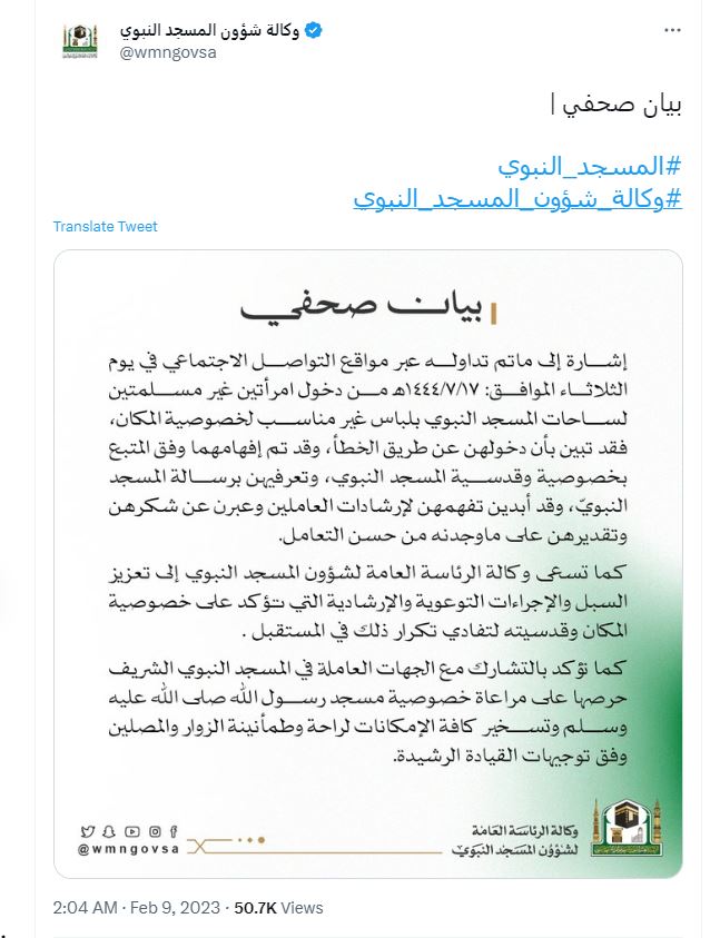 وقال البيان: "إشارة إلى ما تم تداوله عبر مواقع التواصل الاجتماعي في يوم الثلاثاء الموافق: ١٤٤٤/٧/١٧ه من دخول امرأتين غير مسلمتين لساحات المسجد النبوي بلباس غير مناسب لخصوصية المكان، فقد تبين بأن دخولهن عن طريق الخطأ، وقد تم إفهامهما وفق المتبع بخصوصية وقدسية المسجد النبوي، وتعرفيهن برسالة المسجد النبوي، وقد أبدين تفهمهن لإرشادات العاملين وعبرن عن شكرهن وتقديرهن على ما وجدنه من حسن التعامل".