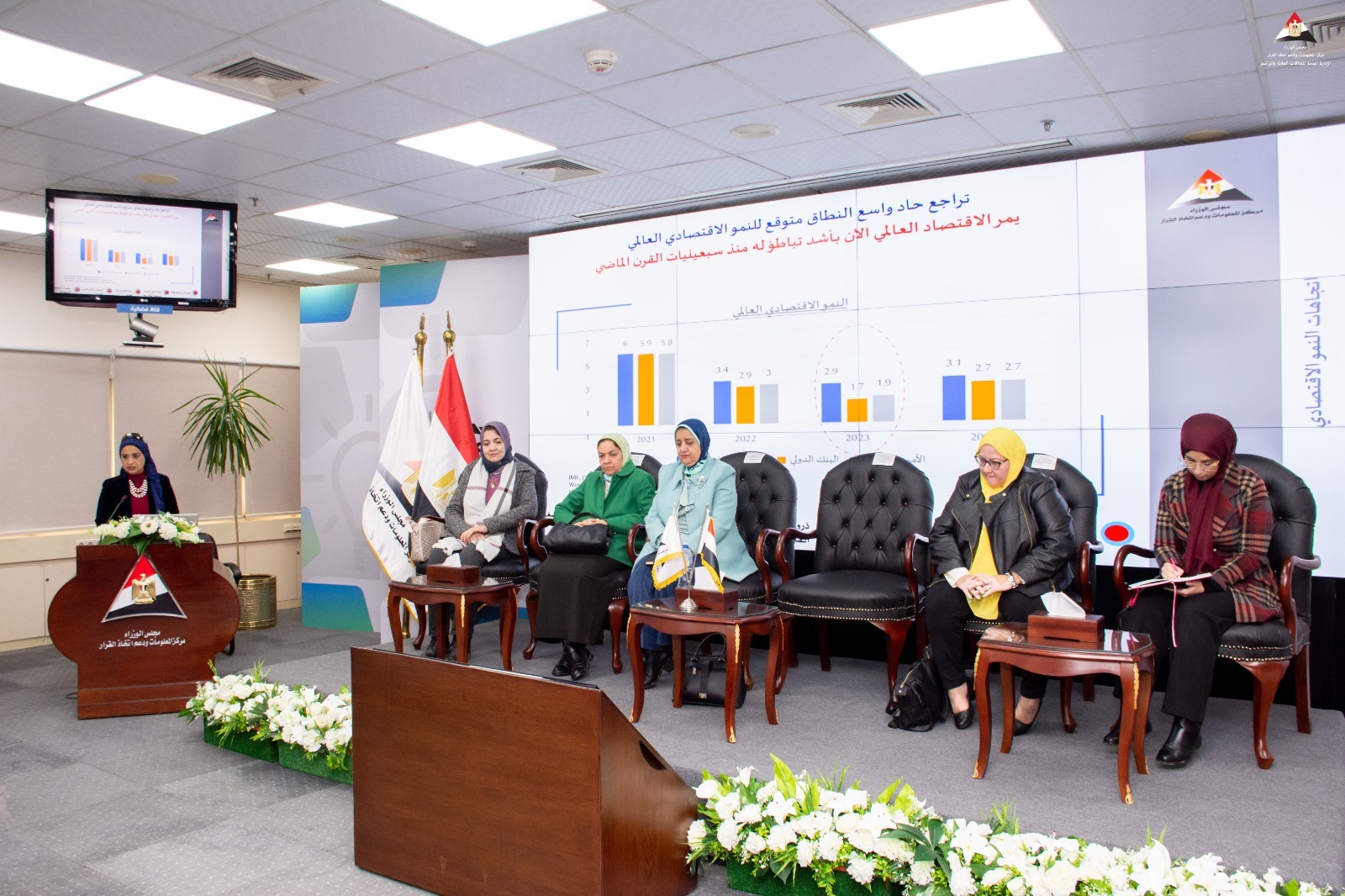 وفي بداية الجلسة الأولى تم تقديم عرض من مركز المعلومات ودعم اتخاذ القرار، ألقى الضوء من خلاله على الأوضاع والمخاطر الاقتصادية المحتملة خلال عامي 2023 و2024، من واقع توقعات وتقديرات المؤسسات الدولية، وذلك بما يشمل توقع حدوث تراجع حاد واسع النطاق للنمو الاقتصادي العالمي خلال عام 2023 لتتراوح معدلات النمو المتوقعة ما بين 1.7% و2.9%، بما يمثل أشد تباطؤ للاقتصاد العالمي منذ سبعينيات القرن الماضي، فيما يتوقع ارتفاع وتيرة النمو الاقتصادي إلى ما يتراوح بين 2.7% و3.1% خلال عام 2024 بالتوازي مع التحسن المتوقع لمستويات النشاط الاقتصادي في عدد من الدول المتقدمة والنامية.