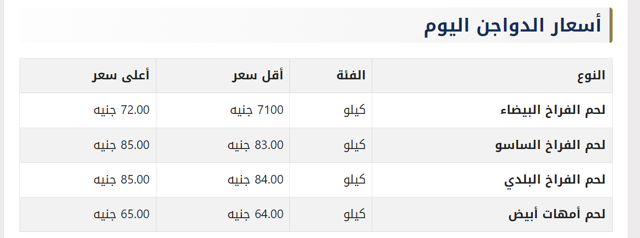 سجل سعر كيلو الدواجن البيضاء ما بين 71 جنيها إلى 72 جنيها للكيلو وسجلت أمس 70 جنيها.