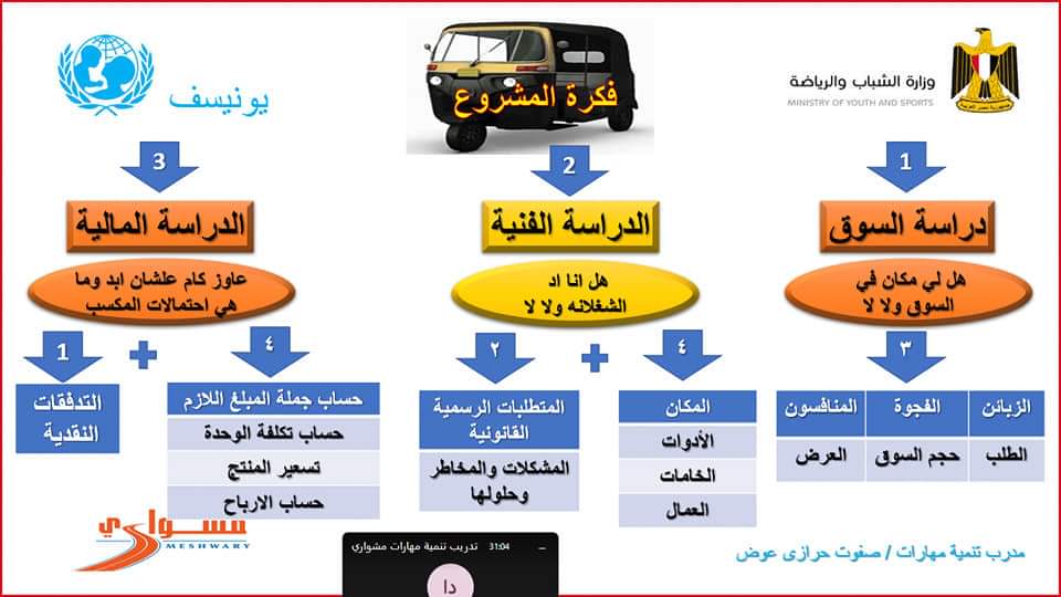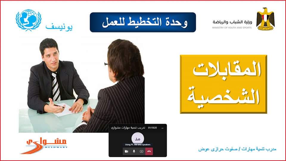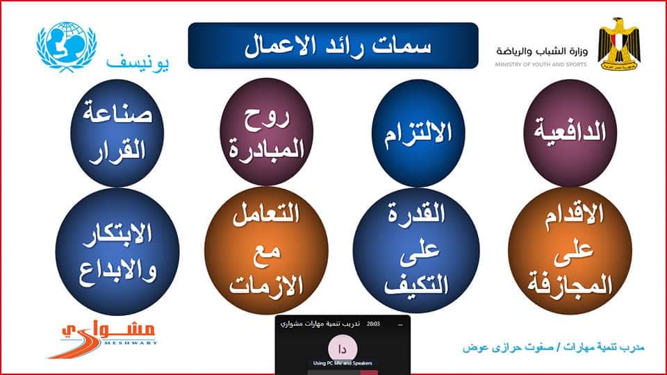وتقدم إدارة التدريب ومشروعات الشباب تدريبات (المشورة والتوجيه المهني - تنمية المهارات الحياتية وريادة الأعمال - تنمية مهارات سفراء مشواري).