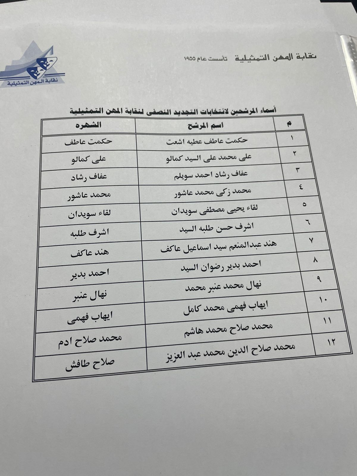 قائمة المرشحين لمجلس نقابة المهن التمثيلية