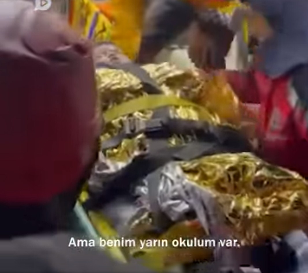 أثار مقطع فيديو متداول على مواقع التواصل الاجتماعي، لأول عبارة تحدث بها طفل تركي، عقب إخراجه من تحت الأنقاض: "غدا سأذهب إلى المدرسة".