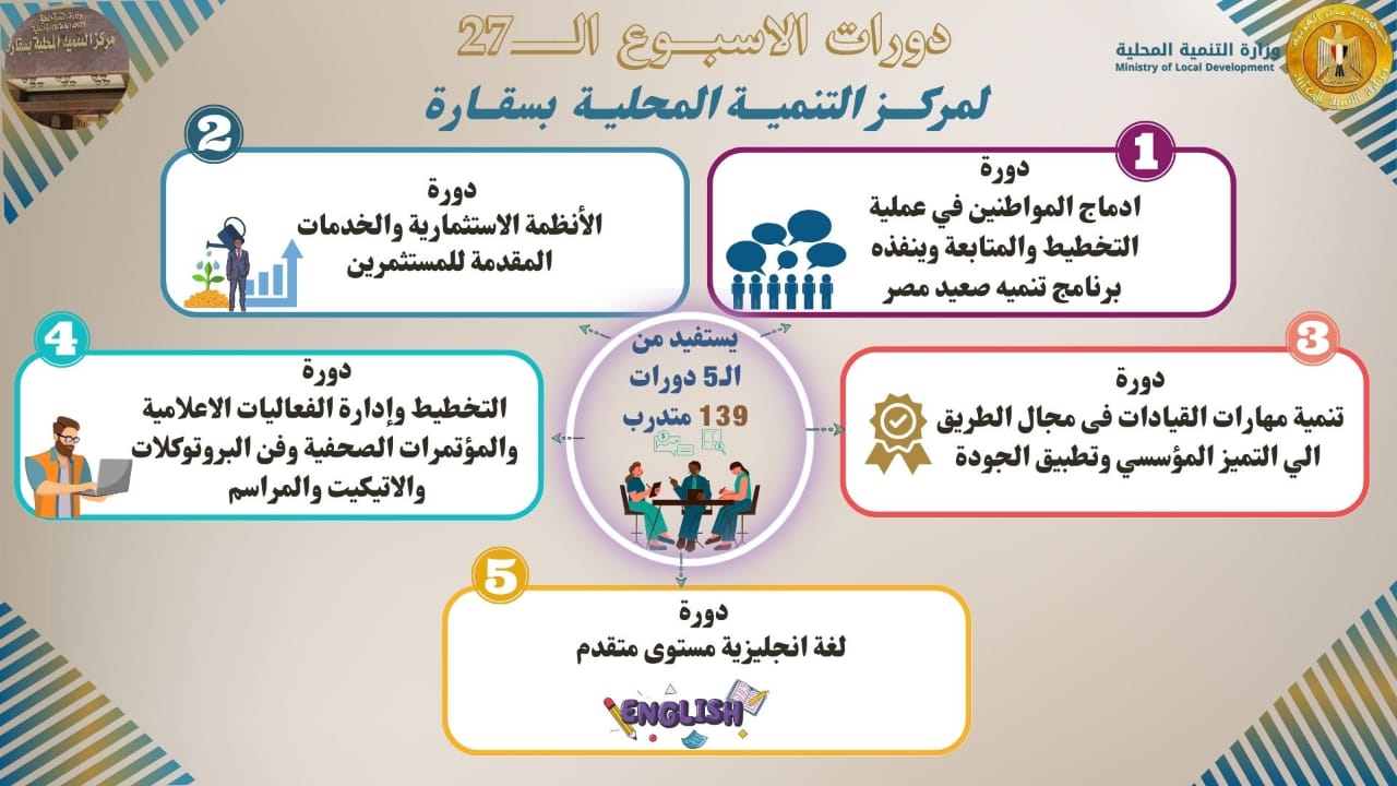 ويشهد تنظيم 5 دورات تدريبية هى: دورة إدماج المواطنين في عملية التخطيط والمتابعة، والتي ينفذها برنامج تنمية صعيد مصر مع اتحاد البلديات الهولندي، تنفيذا للتوجيهات الرئاسية بتعميم الممارسات الجيدة لبرنامج التنمية المحلية بصعيد مصر، ودورة تنمية مهارات القيادات فى مجال الطريق الي التميز المؤسسي وتطبيق الجودة، ودورة الأنظمة الاستثمارية والخدمات المقدمة للمستثمرين، ودورة التخطيط وإدارة الفعاليات الاعلامية والمؤتمرات الصحفية وفن البروتوكلات والاتيكيت والمراسم، إضافة إلى دورة متقدمة فى اللغة انجليزية، ويستفيد من دورات الأسبوع الحالى 139 متدربا من جميع المحافظات، مؤكدا أن الوزارة تعمل جاهدة وتسير بخطى متقدمة ومتسارعة للإرتقاء ورفع مهارات وكفاءة العاملين بالمحليات على مستوى جميع المحافظات.