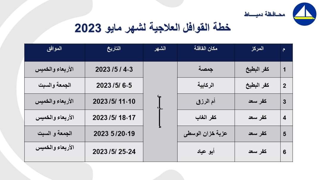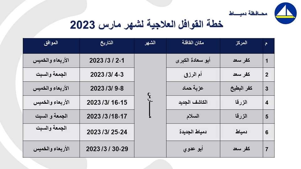 تحت رعاية الأستاذة الدكتورة منال عوض محافظ دمياط والدكتور خالد عبد الغفار وزير الصحة، أعلنت مديرية الصحة بدمياط عن خطتها للقوافل الطبية المجانية العلاجية للأربعة أشهر القادمة والتي تستهدف (24) قرية بعدة مراكز بدمياط، وذلك تيسيراََ على المواطنين بالأماكن البعيدة وتخفيف الضغط على المستشفيات.