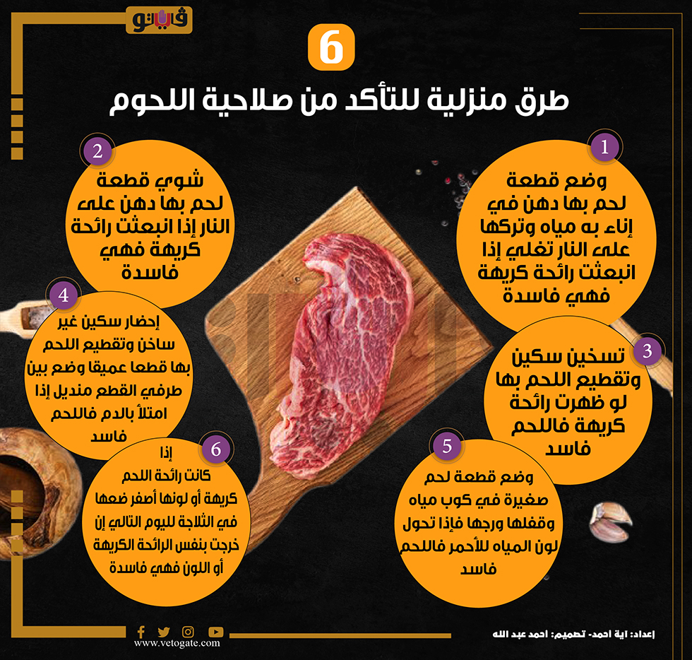 6 طرق منزلية للتأكد من صلاحية اللحوم (إنفوجراف) الأحد 12/فبراير/2023 - 01:34 م 2/12/2023 1:34:41 PM التأكد من صلاحية اللحوم، فيتو آية مصطفى شارك طباعة 18 حجم الخط شارك طباعة اللحوم فساد اللحوم انفوجراف رائحة كريهة انفو