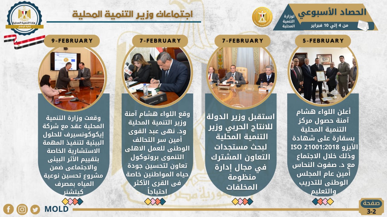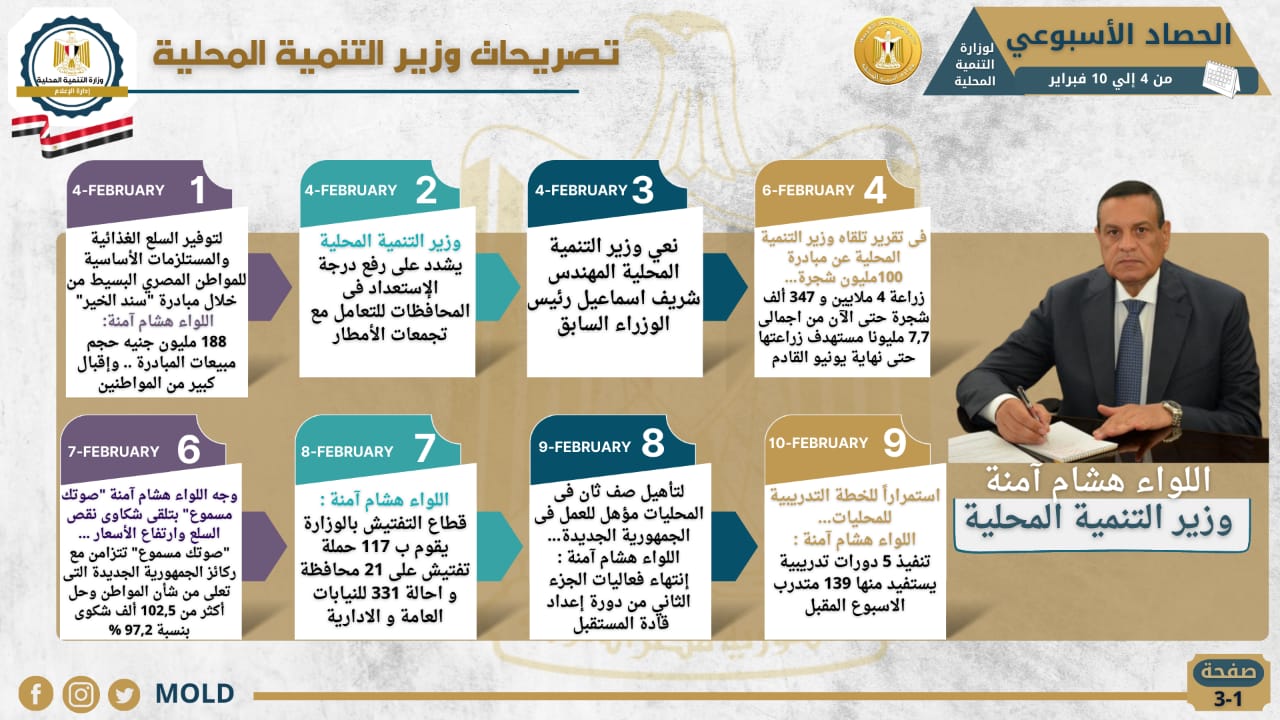 أصدر المركز الإعلامي، التابع لوزارة التنمية المحلية، " الانفوجراف الأسبوعي" في نسخته الـ ٢١ حول حصاد أهم الأنشطة والفعاليات التي قام بها اللواء هشام آمنة وزير التنمية المحلية، خلال الأسبوع الماضي في الفترة من ٤ إلي ١٠ فبراير الجاري، حيث نستعرض أبرزها في التقرير التالي الذي نشرته الصفحة الرسمية لوزارة التنمية المحلية علي موقع التواصل الاجتماعي "فيس بوك" من خلال انفوجراف يرصد أبرز تلك الأنشطة التي جاءت كالتالي: