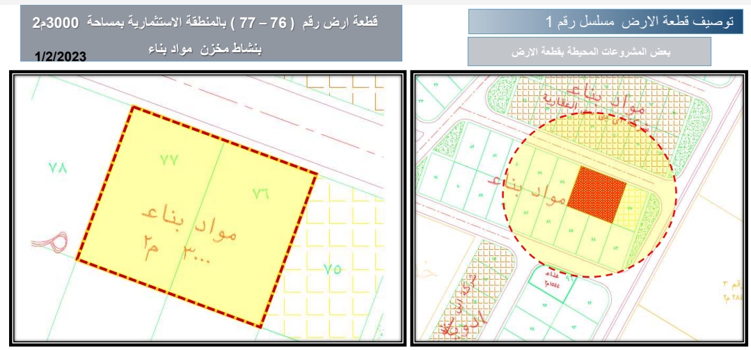 قطعة ارض رقم ( 76-77 ) بالمنطقة الاستثمارية بمساحة 3000م2 بنشاط مخزن مواد بناء وسعرها التقديري 2085 جنيه مصري للمتر مربع.