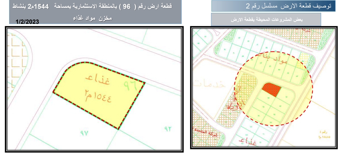 قطعة أرض رقم ( 96 ) بالمنطقة الاستثمارية بمساحة 1544م2 بنشاط مخزن مواد غذاء وسعرها التقديري 2085 جنيه مصري للمتر مربع.