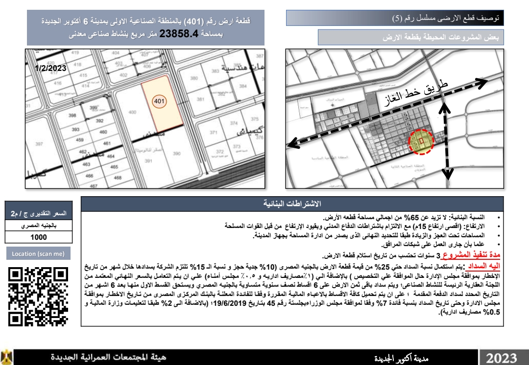قطعة أرض رقم (401) بالمنطقة الصناعية الأولى بمدينة 6 أكتوبر الجديدة بمساحة 23858.4 متر مربع بنشاط صناعي معدني وسعرها التقديري 1000 جنيه مصري للمتر مربع.