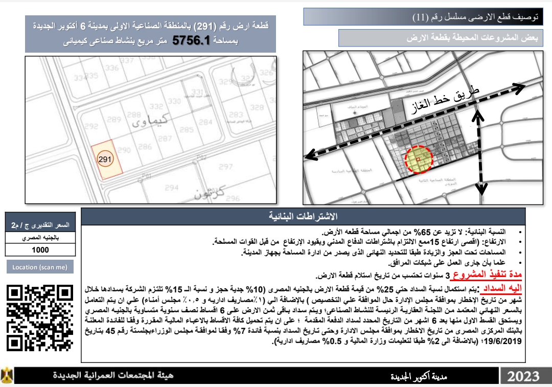 قطعة أرض رقم (291) بالمنطقة الصناعية الأولى بمدينة 6 أكتوبر الجديدة بمساحة 5756.1 متر مربع بنشاط صناعی کیمیائی وسعرها التقديري 1000 جنيه مصري للمتر مربع.