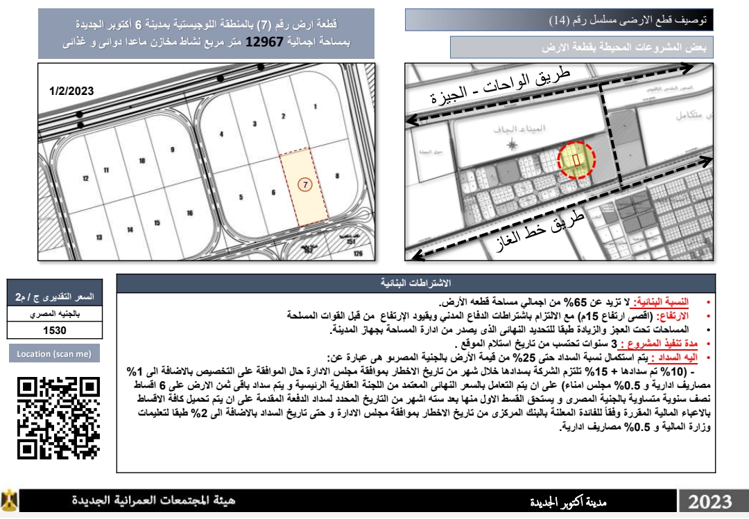 قطعة أرض رقم (7) بالمنطقة اللوجيستية بمدينة 6 أكتوبر الجديدة بمساحة اجمالية 12967 مترا مربعا نشاط مخازن ماعدا دوائی وغذائی وسعرها التقديري 1530 جنيها مصريا للمتر مربع.