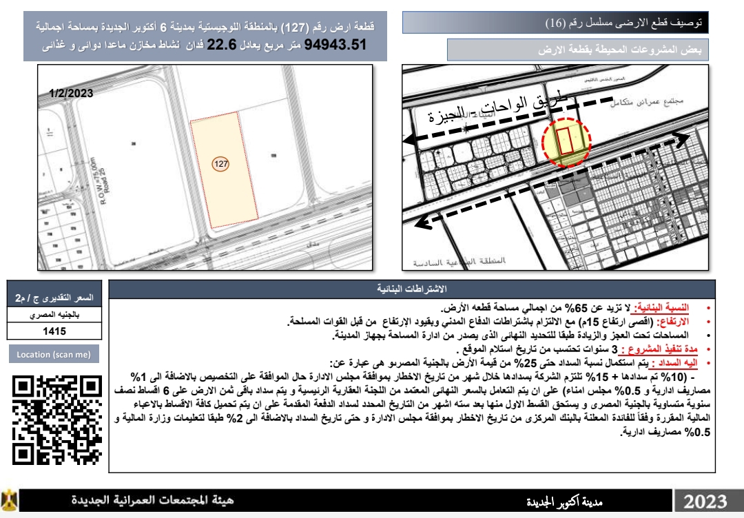 قطعة ارض رقم (127) بالمنطقة اللوجيستية بمدينة 6 أكتوبر الجديدة بمساحة اجمالية 94943.51 متر مربع يعادل 22.6 فدان نشاط مخازن ماعدا دوائي وغذائي وسعرها التقديري 1415 جنيها مصريا للمتر مربع.