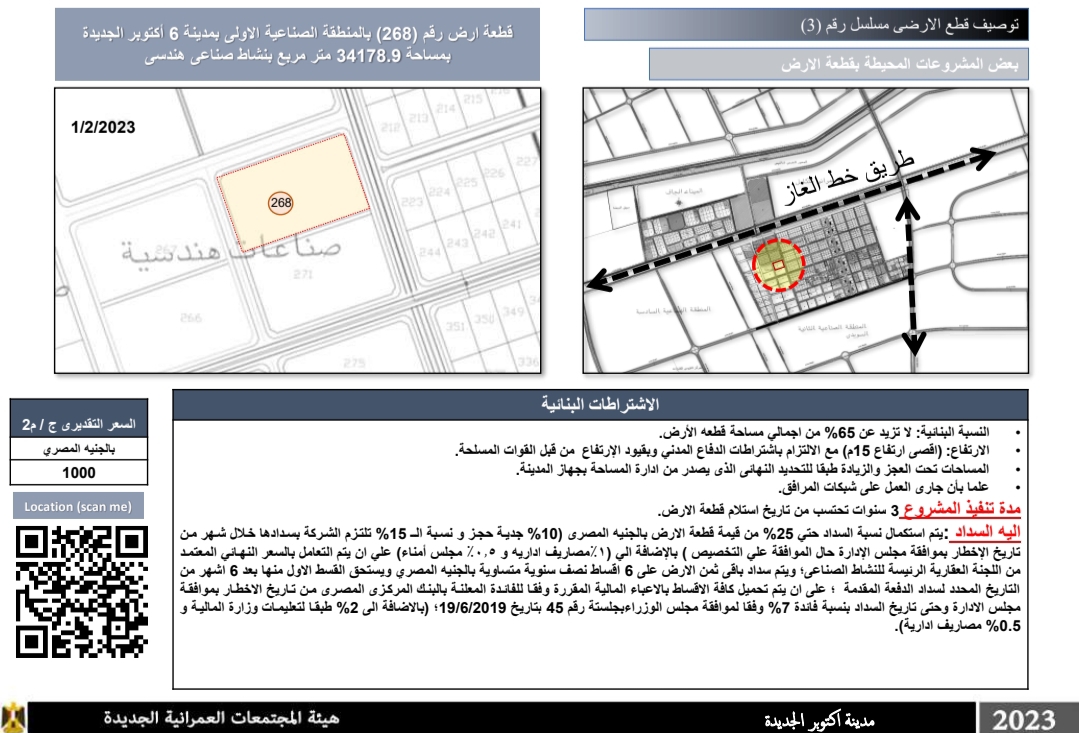 قطعة أرض رقم (268) بالمنطقة الصناعية الأولى بمدينة 6 أكتوبر الجديدة بمساحة 34178.9 متر مربع بنشاط صناعی هندسي وسعرها التقديري 1000 جنيه مصري للمتر مربع.