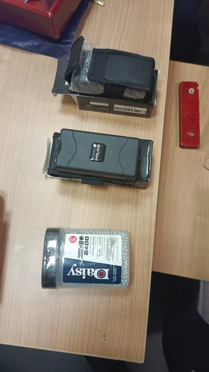 قام هاني أبو طالب مدير الحركة المشرف على صالة الوصول بمبني الركاب رقم ٣ بتكليف علاء عبد الرحمن خضر مأمور الجمرك بتفتيش حقائب الراكب يدويا مما أسفر عن ضبط جهازي رادع كهربائي مرقوم عليهما police محظور حيازتهم طبقا للقانون رقم ٣٩٤ لسنة ١٩٥٤ و٢٤٠٠ طلقة ضغط هواء عيار ٤.٥ مل يلزم لدخولهم البلاد تصريح من الأمن العام.