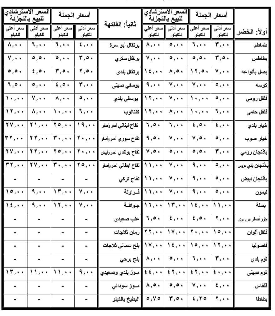 وسجلت أسعار الفلفل الألوان ما بين 12 و20 جنيها، وسجل كيلو القلقاس من ٤ إلى ٦ جنيهات، وبلغ سعر الثوم من 7 إلى 11 جنيها، وسعر خس كابوتشي 5 جنيه وذلك ضمن أسعار الخضروات اليوم.